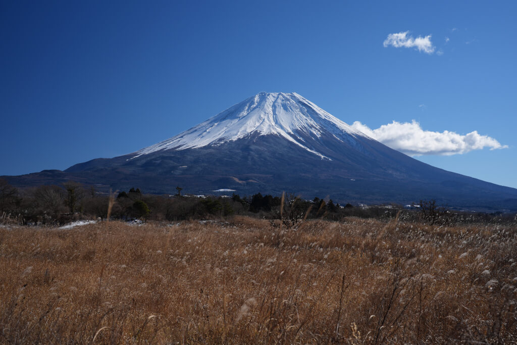 広角レンズで地面すれすれのローアングルで撮影してみると、なんだか富士山が可愛く写った。