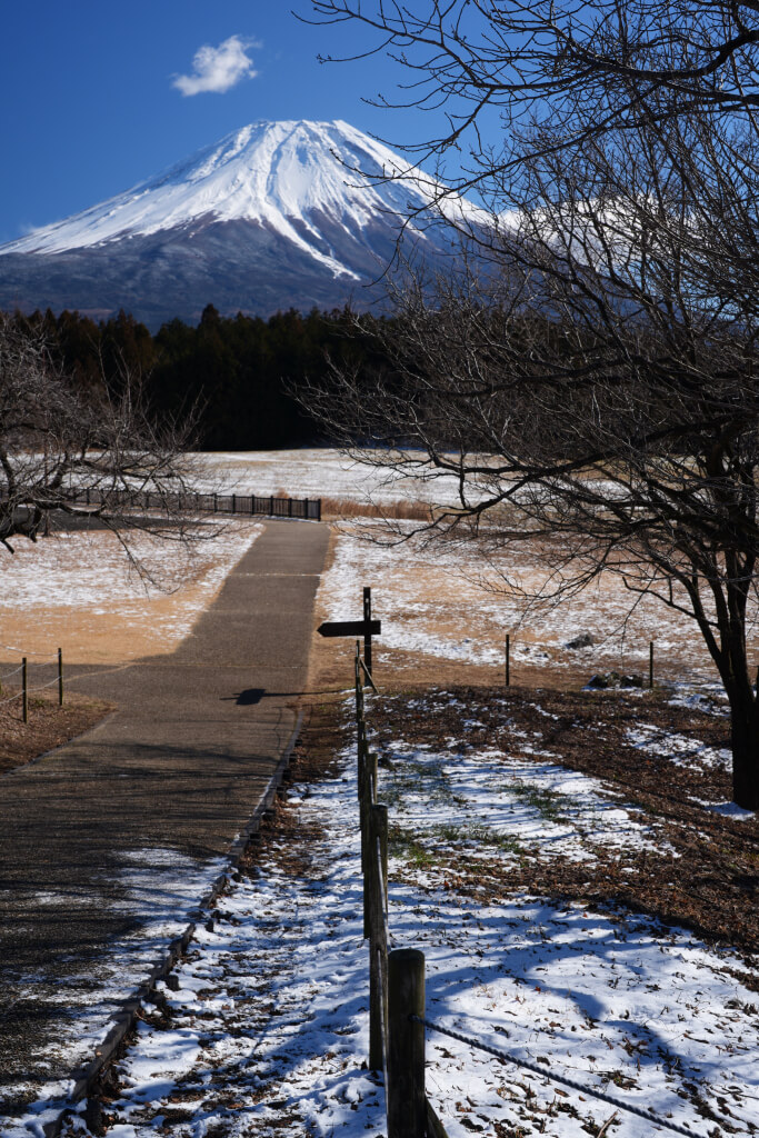 地面に雪が残っていた寒い日、ローアングルで富士山写真撮影して他にはない画になった。