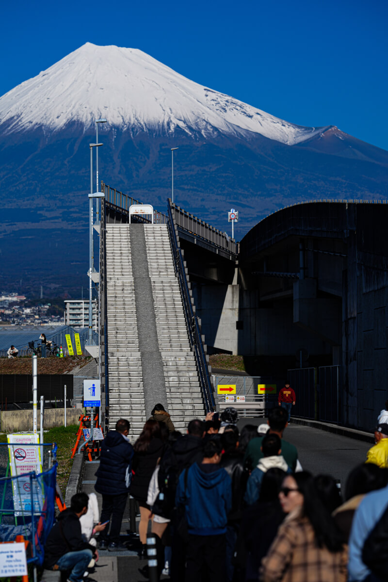 十分な冠雪量の富士山と、望遠レンズがあれば、富士山夢の大橋での天空の階段写真が完成する。