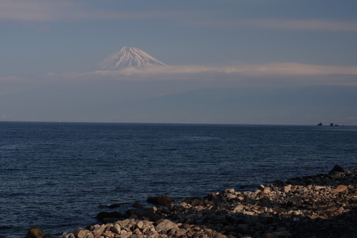 海辺から撮った富士山、井田には海水浴場もある。