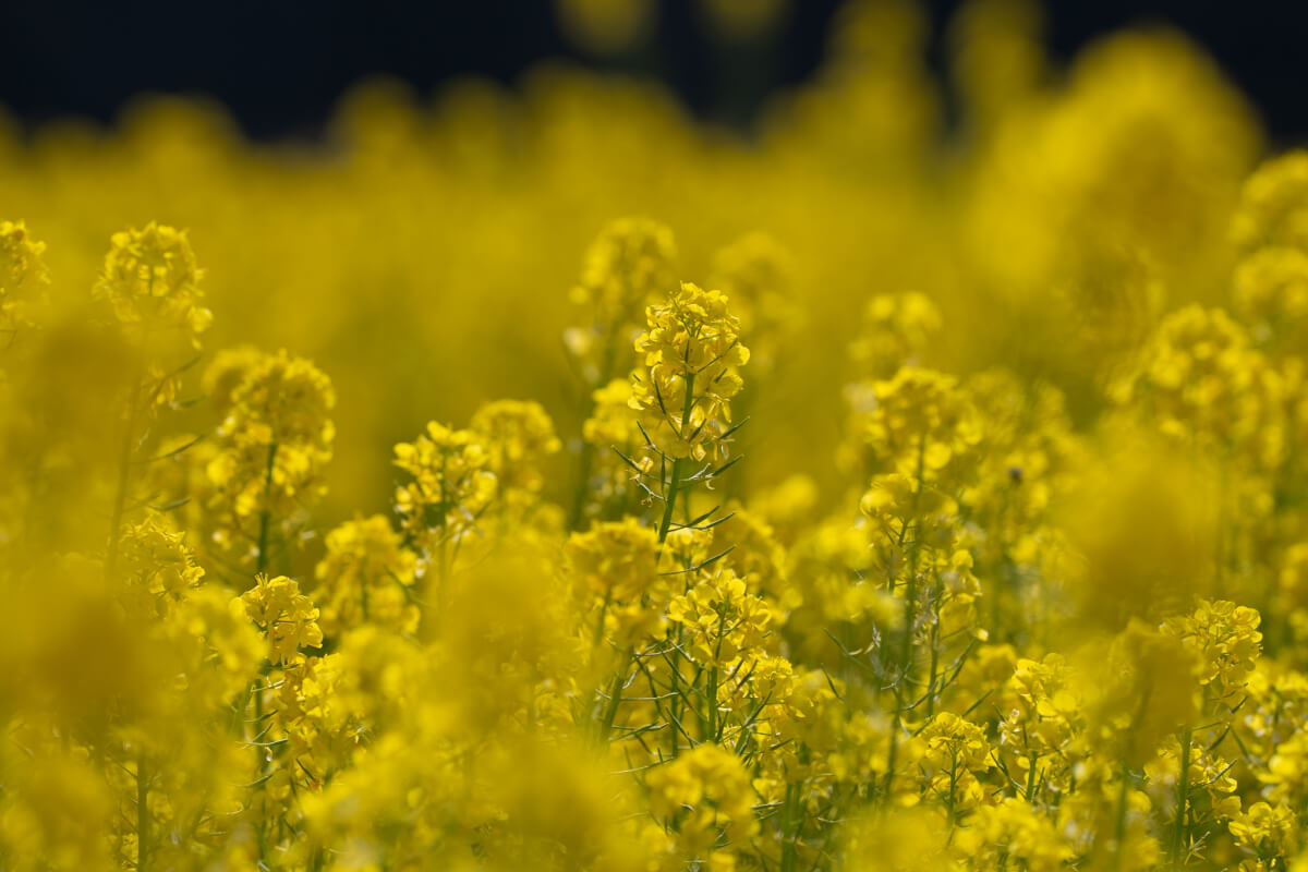菜の花畑の色が鮮やか、前ボケと後ボケを計算しながら、ピントは中央近辺に合わせて撮る。