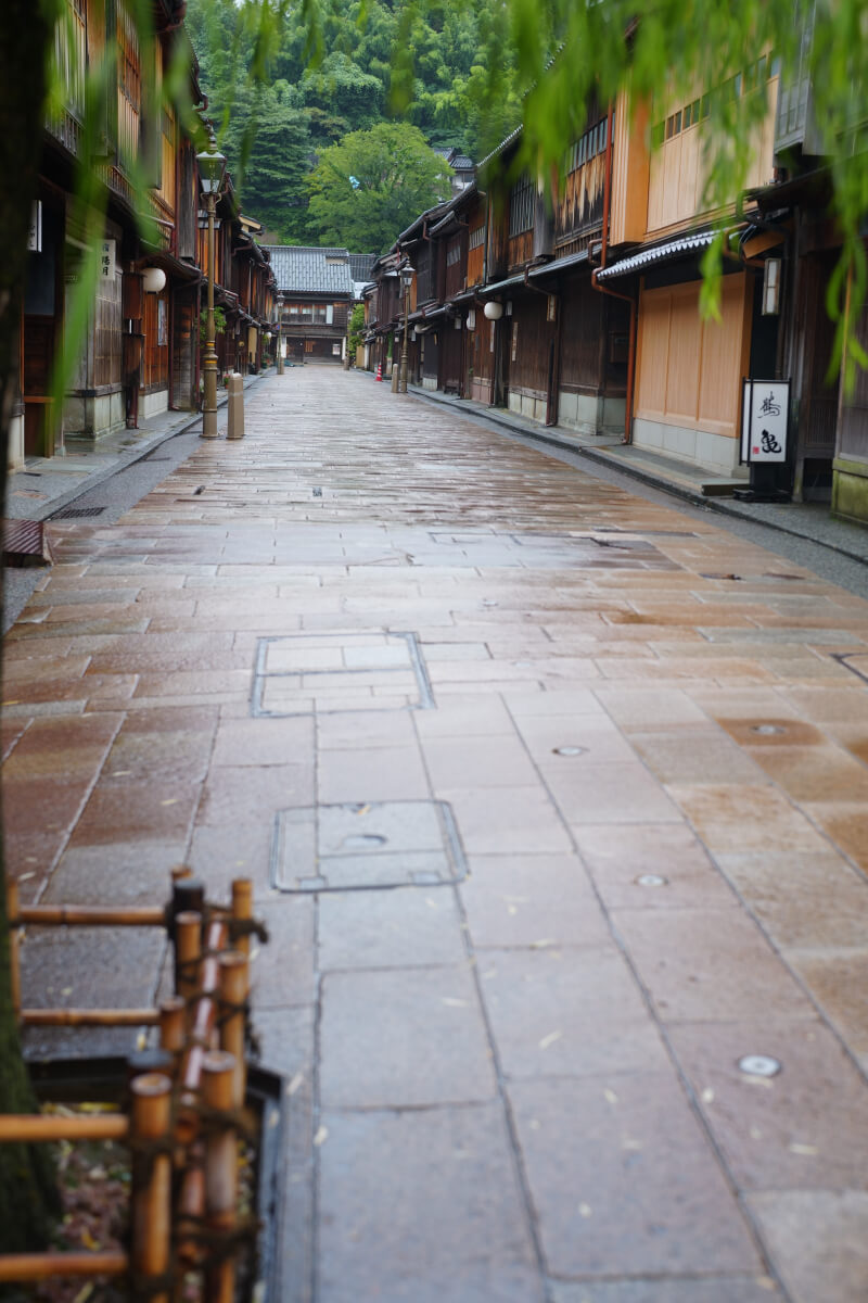雨上がり、早朝6:00過ぎに金沢ひがし茶屋街にきてみると、さすがに無人の広見とメイン通りを見れた。