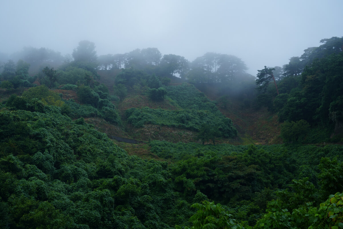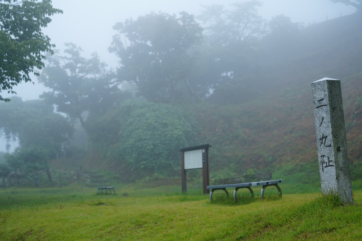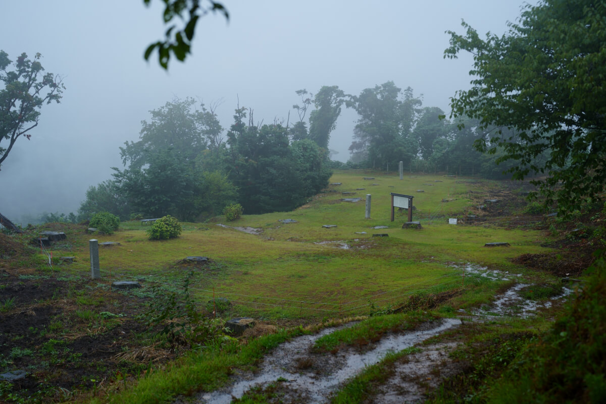 春日山神社下の駐車場に車を停めて、春日山神社を通って上杉謙信公銅像から春日山城本丸を望む、朝の深い霧で何も見えない。