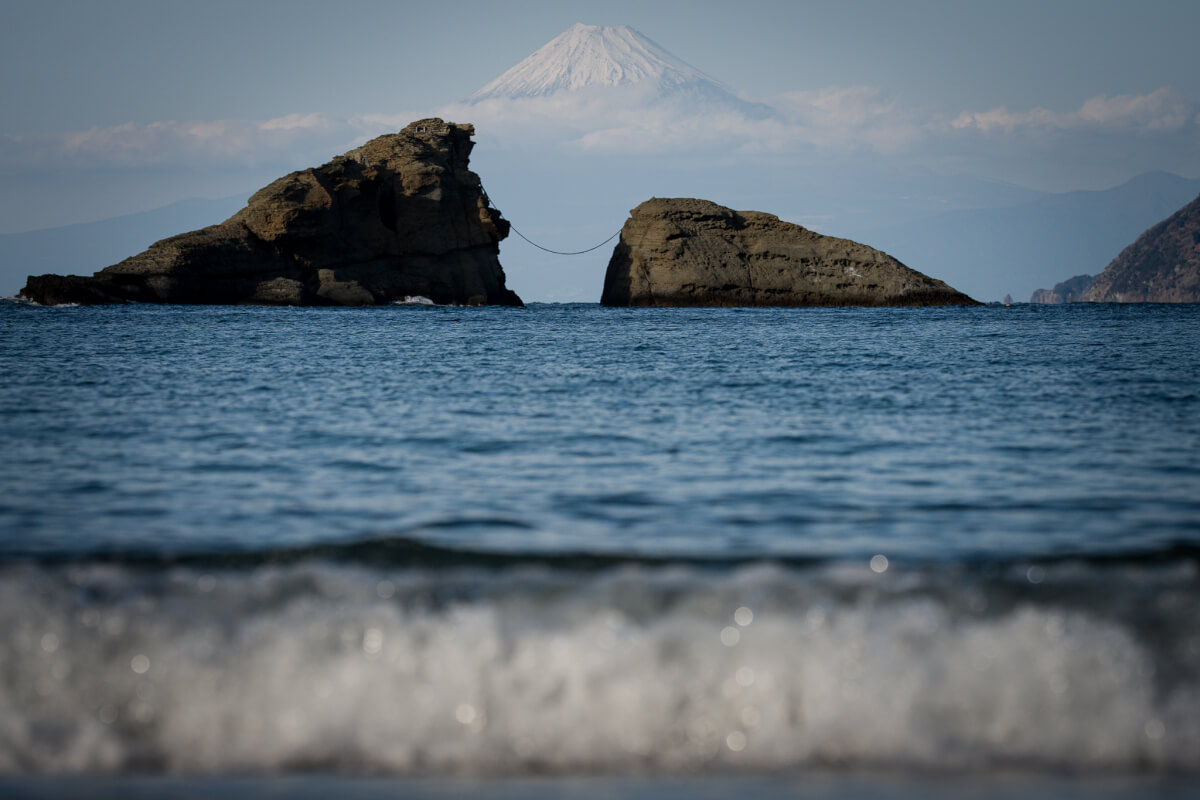 圧縮効果で牛着岩のすぐ後ろに富士山がいるような写真になる、実際は70km離れているのに。