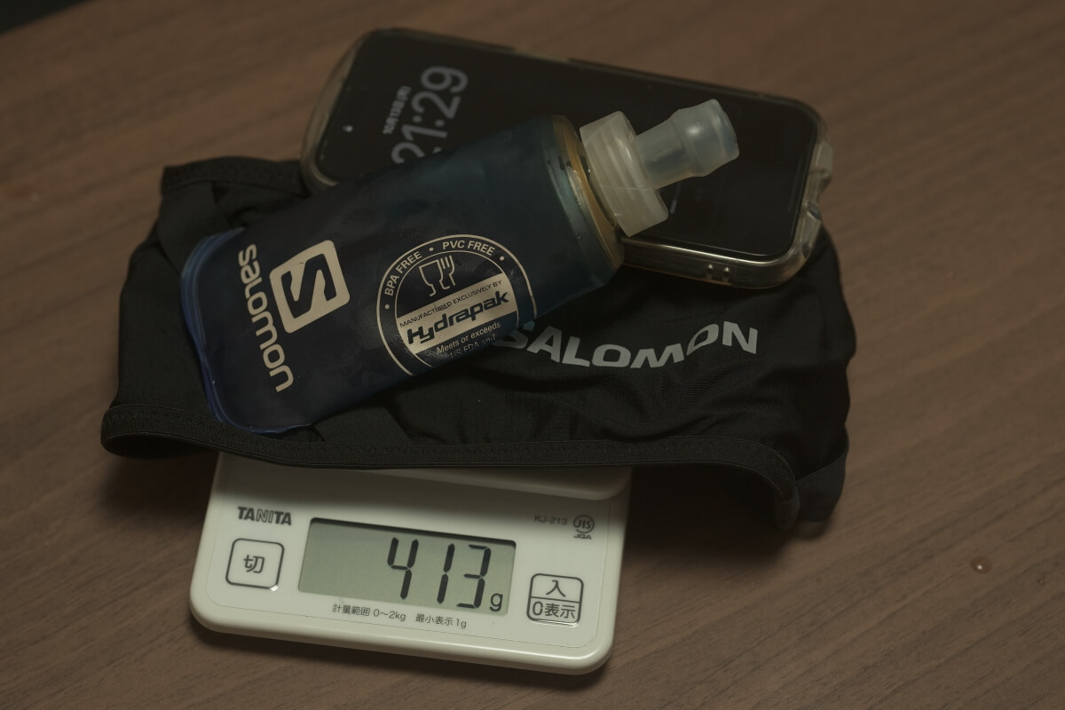 この日はサロモン・パルスベルトに150mlソフトフラスコとiPhone15proを入れてのランニング。