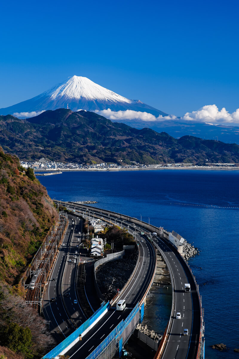 同じく75mmの横構図、肉眼(50mmぐらい)よりも若干望遠よりで、欲しい素材(富士山/駿河湾/高速道路)がバランスよく入った。