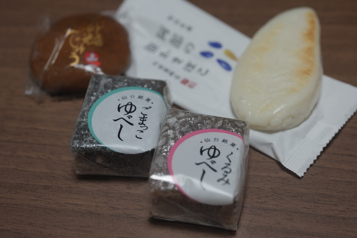 仙台銘菓のくるみゆべし、笹かまぼこ、黒砂糖まんじゅう、どれも美味しかった、ずんだシェイクもいただきました。