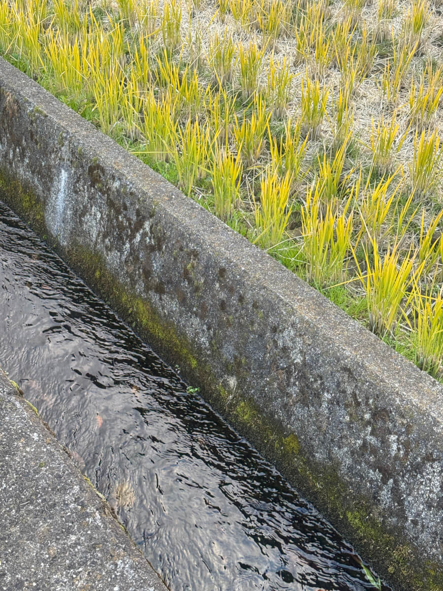 刈り取られた稲の色、そして水路の流れが美しくて走る足を止めた。